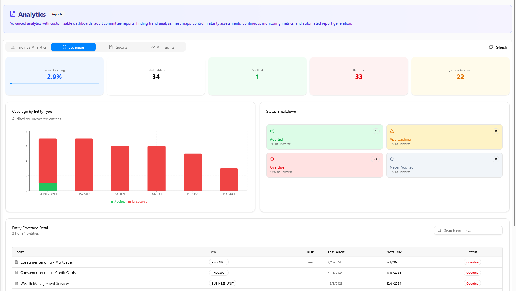 Strong audit coverage across all auditable entities with real-time tracking and risk-based prioritization.