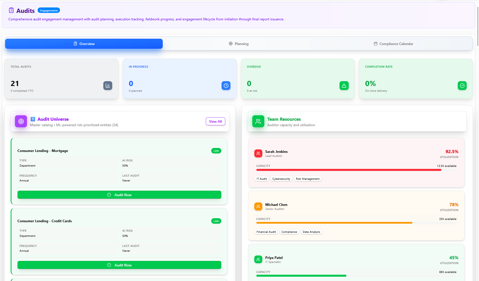 The engagement management hub providing a structured lifecycle for planning, executing, and closing audits. Risk-based audit planning ensures audit resources are focused where risk impact is greatest, with automated sampling, evidence tracking, and coverage dashboards showing percentage of auditable entities reviewed.
