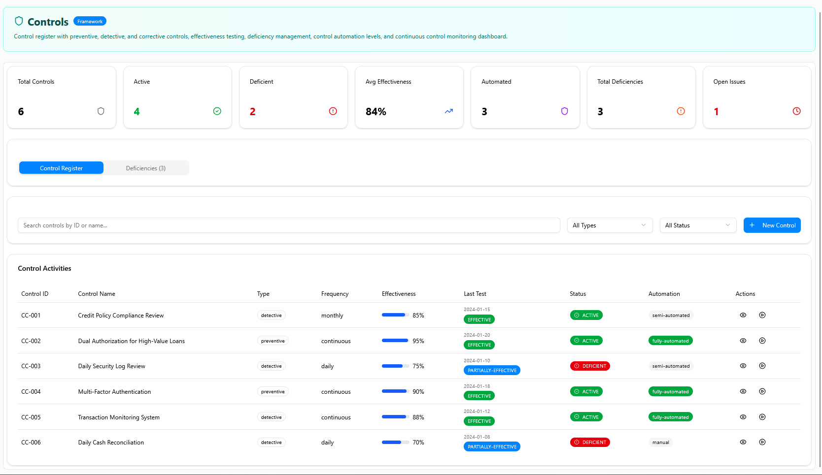 The control framework management hub consolidating all internal controls with risk and audit integration. Controls are categorized by type (preventive, detective, corrective) with effectiveness ratings (Strong, Moderate, Weak) and automated testing workflows linked to RCSA outputs.