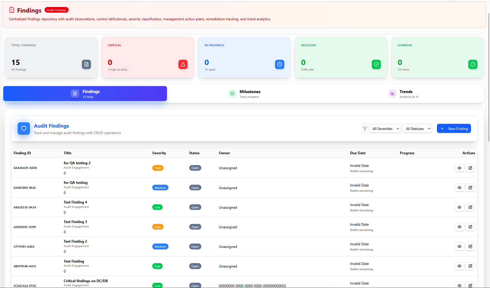 The centralized repository for audit observations and control deficiencies with structured workflows for classifying findings by severity (Critical, High, Medium, Low), assigning remediation actions, and tracking progress. AI-powered insights highlight anomalies, recurring issues, and systemic control gaps.