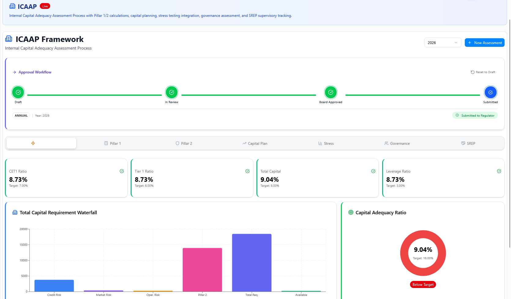 The Internal Capital Adequacy Assessment Process integrating Pillar 1 and Pillar 2 calculations, stress testing, governance workflows, and SREP tracking. Ensures the institution maintains sufficient capital buffers with CET1, Tier 1, Total Capital, and Leverage Ratio monitoring.