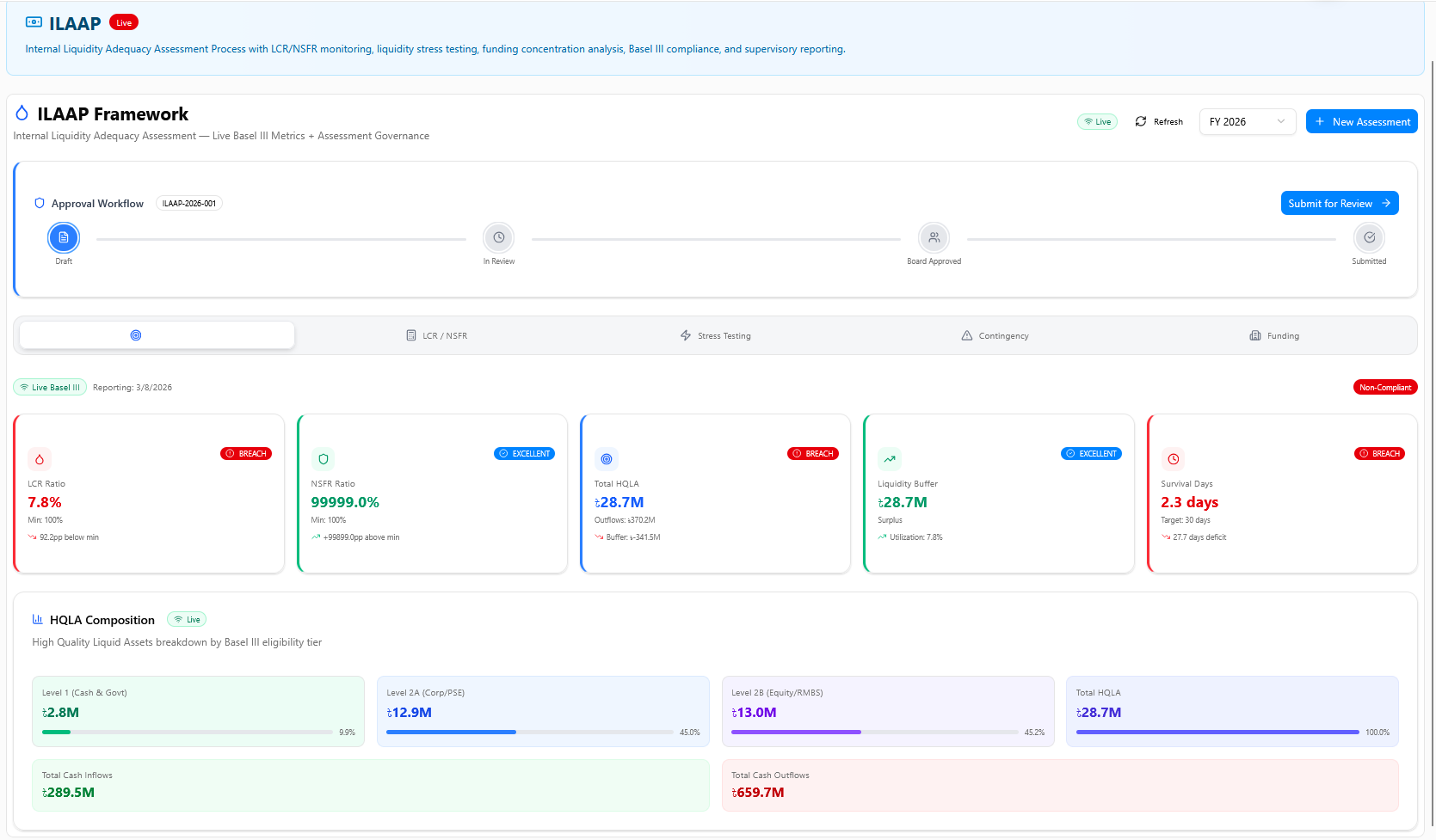 The Internal Liquidity Adequacy Assessment Process ensuring sufficient liquidity buffers under normal and stressed conditions. Integrates LCR, NSFR monitoring, cash flow projections, stress testing with reverse stress scenarios, and SREP-aligned governance workflows.