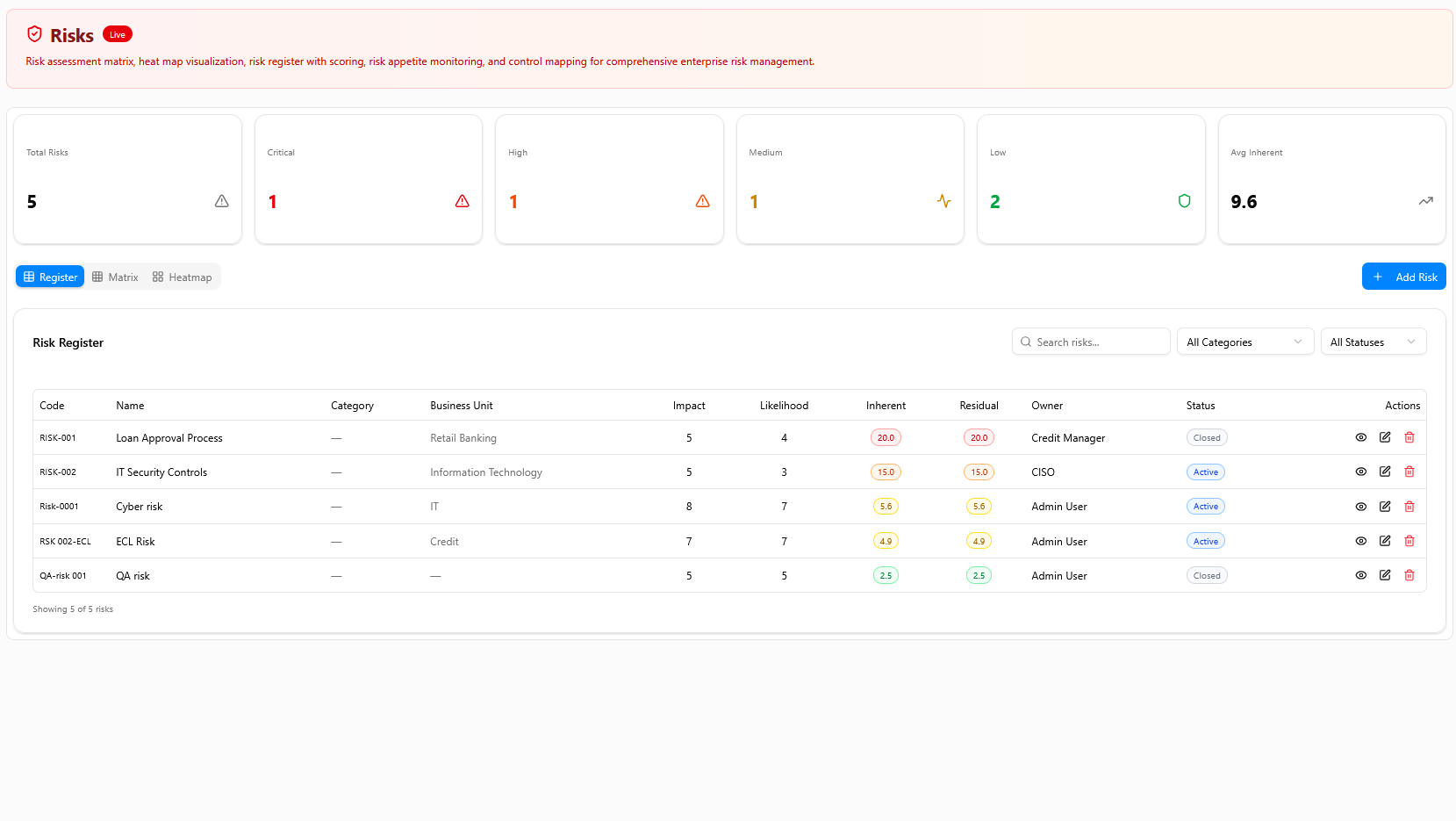 The risk assessment hub consolidating all enterprise risks into a structured matrix with scoring, appetite monitoring, and control mapping. Each risk is logged with inherent vs. residual scoring, status tracking, and heatmap visualization for quick identification of critical risks.