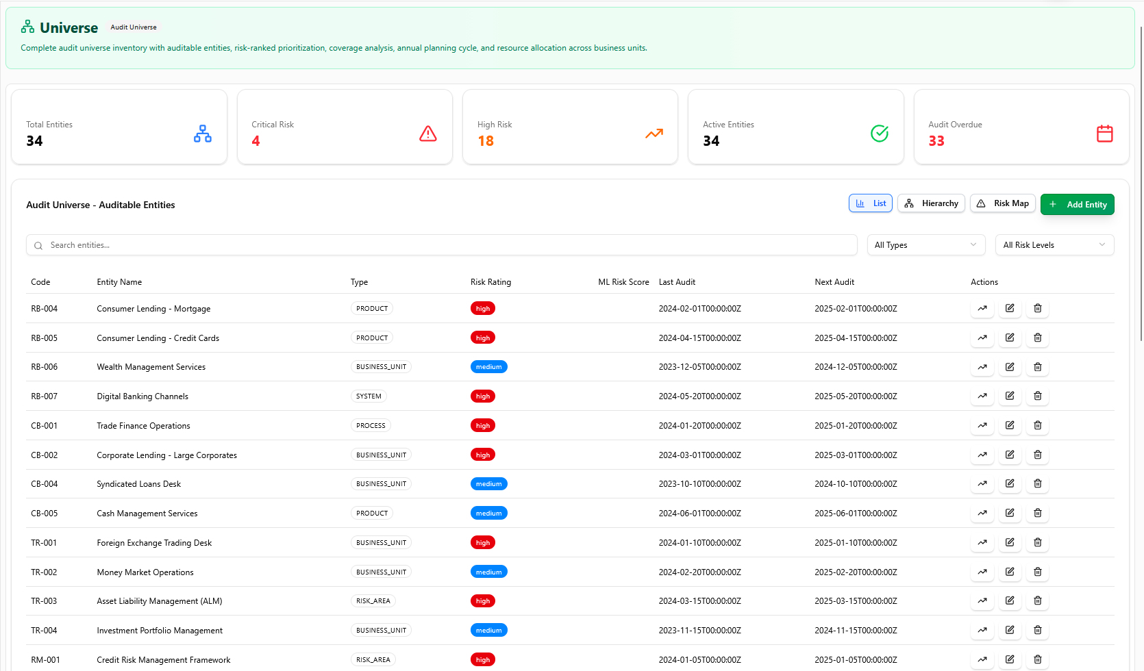 The auditable entity catalog maintaining a centralized inventory of all business units, processes, systems, and functions subject to audit. Each entity is mapped to risks, controls, and compliance requirements — ensuring risk-based coverage with heatmaps highlighting high-risk entities not yet audited.
