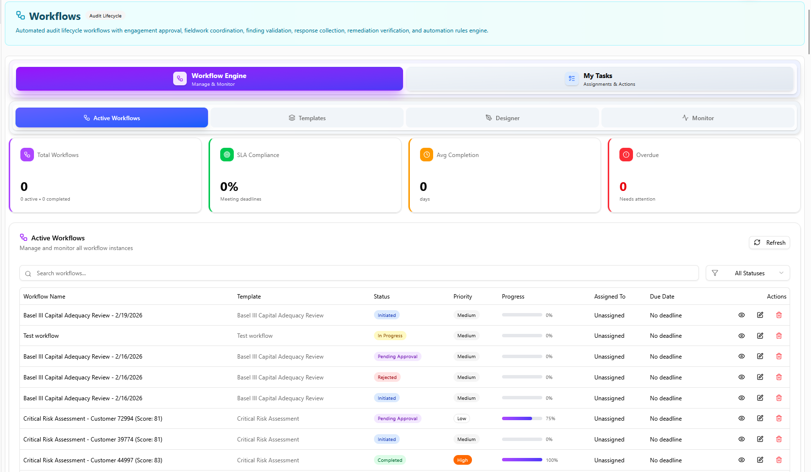 End-to-end process automation from audit planning through findings remediation with SLA monitoring.